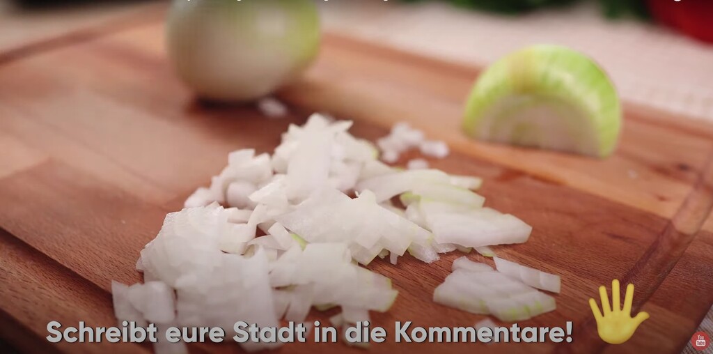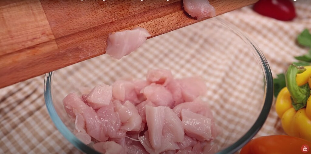 Тщательно перемешиваю так, чтобы каждому кусочку филе достался вкус и аромат специй. В этом рецепте я люблю использовать оливковое масло. Такое масло, на самом деле, наиболее удачно сочетается с орегано, тимьяном и паприкой. Масло буквально пропитывает кусочки филе и придает особый пикантный вкус, насыщая курочку ароматом специй. Впрочем, Вы можете использовать любое рафинированное растительное масло по вашему вкусу. Режу лук и отправляю в сковороду с горячим растительным маслом чтобы обжарить до золотистого цвета.