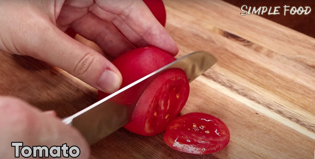 Итак, первым делом возьмем помидоры. Нам их нужно будет нарезать на кружочки, не очень тонко и не очень толсто, вот примерно так как, у меня.