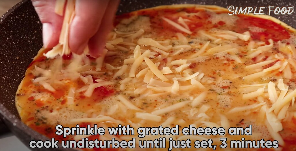 Яичная смесь должна полностью покрыть все помидоры. Сверху на яйца выкладываем измельченный сыр чтобы хорошенько его распределить по всей поверхности. Впрочем, сыра не жалейте, его точно много здесь не будет.