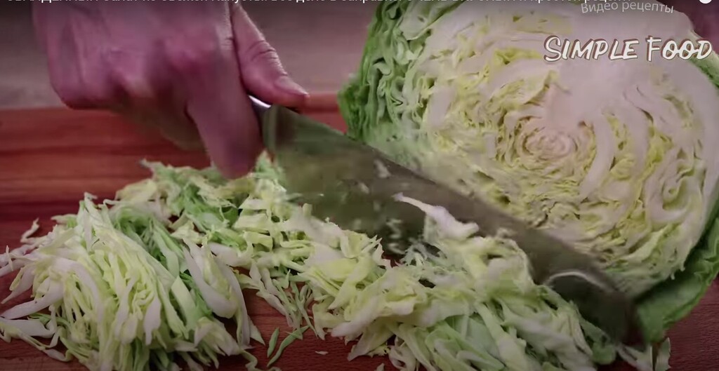Итак, первым делом, конечно же, мы займемся капустой. Ее нужно хорошенько измельчить, я делаю это обычным ножом, но можно измельчать так, как вам больше нравиться.
