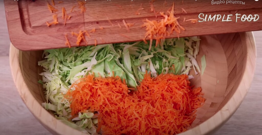 Подготовленную капусту отправляем в большой салатник. Я сразу делаю много, потому что это будет очень вкусно! Теперь морковь, одной среднего размера будет вполне достаточно. Измельчаем ее на мелкой терке, так готовое блюдо получится невероятно сочным и нежным. Конечно морковь лучше выбирать сладкую и сочную. Отправляем ее к капусте в салатник.