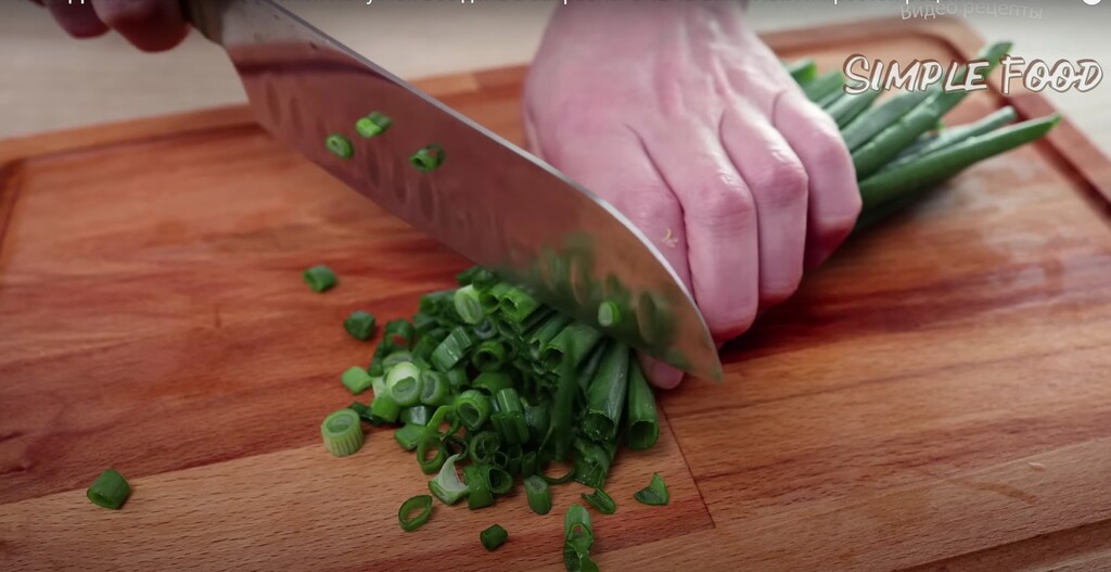 Теперь зеленый молоденький лучок. У меня вот такой большой пучок, нам нужна только зеленая его часть. Измельчаем лук, но не сильно мелко, вот примерно так как у меня. Не бойтесь, лука совсем не много, но если не любите молодой лук, можно взять чуть меньше, это все только по вашему желанию. Подготовленный лук отправляем к остальным ингредиентам.