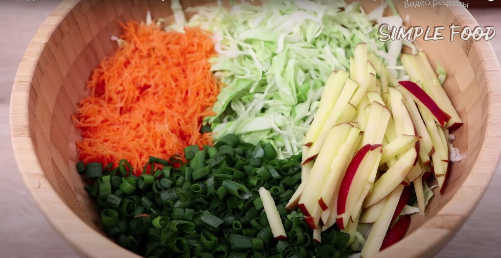 И теперь каждую дольку нарезаем тоненькой соломкой. Нарезанные яблоки отправляем в салатник к остальным овощам.