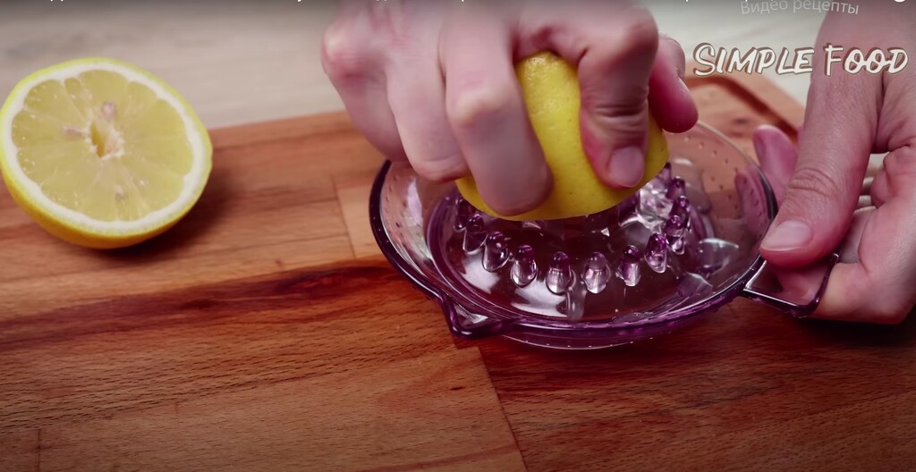 Теперь лимон, нам нужна его половинка, выбирайте тонкокожий лимон, в нем будет больше сока и он намного вкуснее. Из одной половинки лимона нам нужно получить сок. Я делаю это с помощью самой простой ручной соковыжималки для цитрусовых, но можно просто выдавить сок руками, если такой нет.