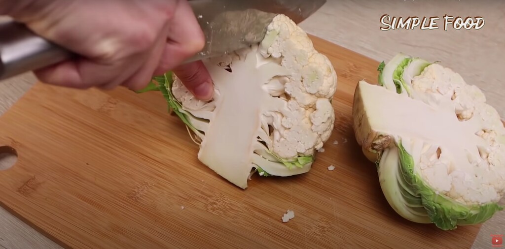 Итак, беру небольшой кочан цветной капусты и разрезаю его сначала пополам,