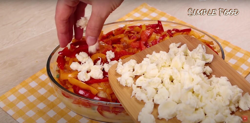 и сверху выкладываю обжаренный перец с луком. Равномерно распределяю перец и сверху я выкладываю кусочки сыра, кстати, у меня сегодня моцарелла.