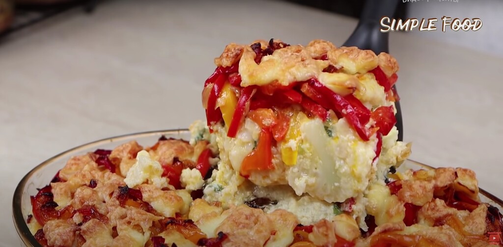 Запеканка с цветной капустой готова. Нежность сыра и молока в сочетании с зеленым луком и сладким перцем раскроют вкус цветной капусты с новой стороны. Теперь можно подать к ней салат из свежих овощей.