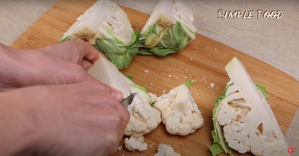 а затем каждую половину еще на две части. Так будет, кстати, удобнее разобрать капусту на соцветия. Выбирая цветную капусту обратите внимание прежде всего на плотность кочана. Только у свежей капусты будет плотный, тяжелый кочан с белыми головками.