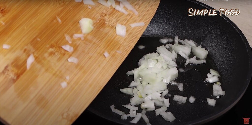 Пока капуста варится, подготовим остальные овощи. Так как рецепт очень простой и быстрый, многие процессы я делаю параллельно. Луковицу нарезаю довольно мелко и отправляю на разогретую сковороду чтобы обжарить.