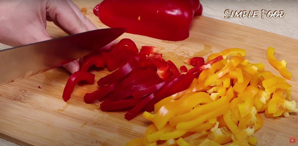 Нарезаю сладкий болгарский перец. Кстати, я часто использую для этого рецепта замороженный болгарский перец, который заготовливаю с лета. Такой перец, на самом деле, часто можно найти в любом супермаркете в отделе замороженных овощей. Конечно, это на случай, если Вы готовите зимой. Безусловно в сезон необходимо готовить только со свежих овощей.