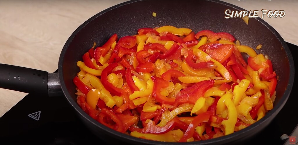 Перец отправляю тоже на сковороду к луку чтобы обжаривать еще около пяти минут.