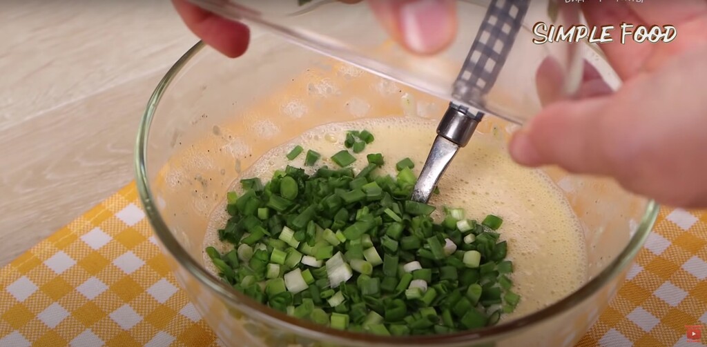 Хорошо вилкой перемешиваю чтобы смешать все ингредиенты. Теперь в эту яично — молочную массу добавляю муку чтобы снова хорошо все перемешать. Буквально пару минут и готово. В такую заливку я обязательно добавляю мелко нарезанный зеленый лук. Лук добавляет пикантности, аромата и вкуса, к тому же очень полезный. Снова все перемешиваю. В итоге заливка готова.