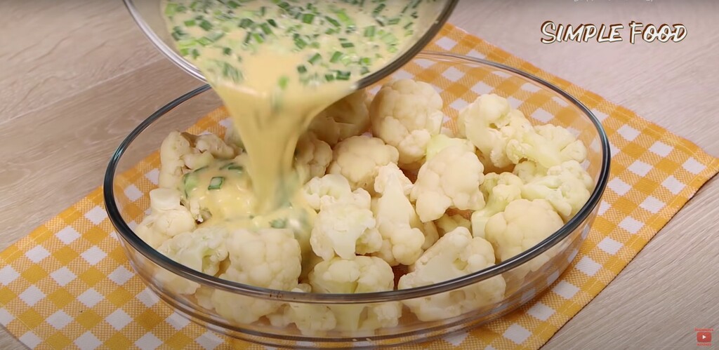 Беру подходящую емкость в которой буду запекать блюдо. Выкладываю цветную капусту чтобы равномерно распределить. Заливаю яично-молочной заливкой